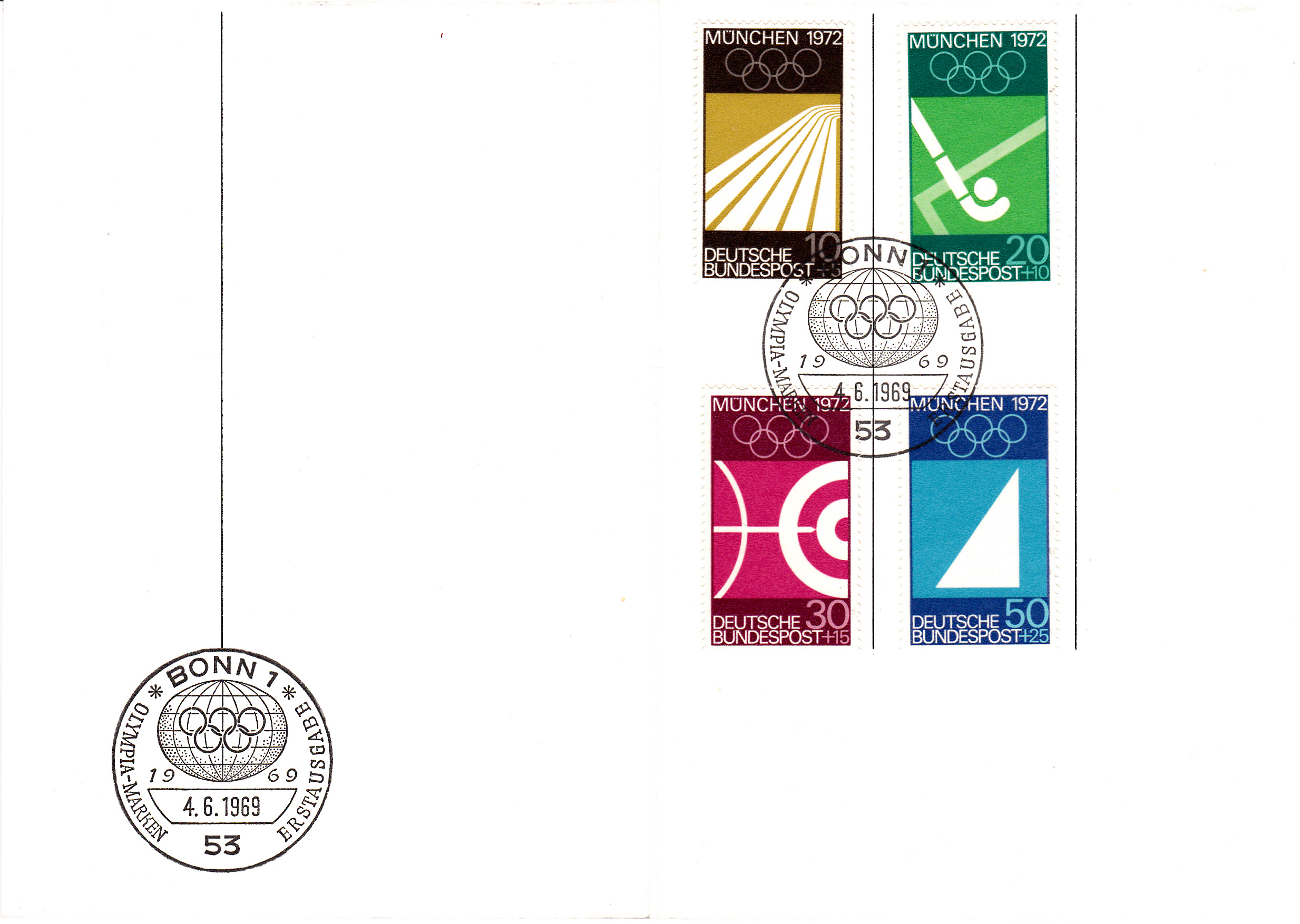 Diese Klappkarte des Organisationskomitees der XX. Olympischen Sommerspiele in München enthält die Olympia-Sonderpostwertzeichenserie 1969, die mit Zuschlag für die Olympischen Spiele 1972 erschienen sind.