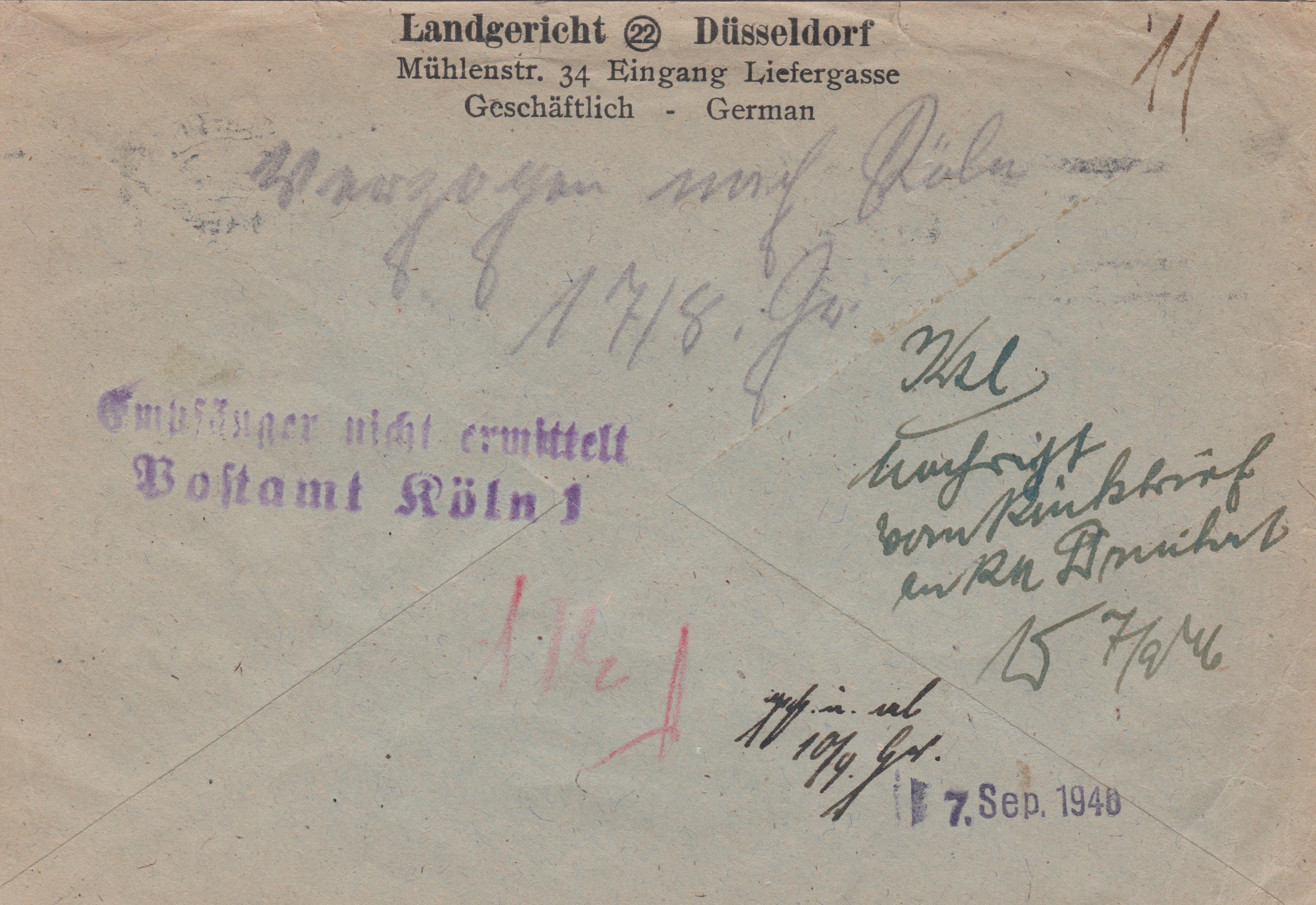 Rückseitig wurde ein Stempel abgeschlagen "Empfänger nicht ermittelt Postamt Köln 1" und der Brief ging an den Absender "Zurück".
