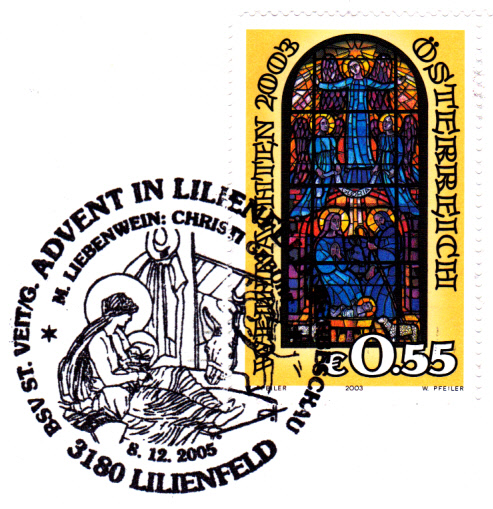 Sonderstempel aus A-3180 Lilienfeld "Advent in Lilienfeld". Abbildung im Stempel: Christi Geburt von Maximilian Liebenwein. Maximilian Liebenwein (* 11. April 1869 in Wien; † 17. Juli 1926 in München) war ein österreichisch-süddeutscher Maler, Graphiker und Buchillustrator zwischen Impressionismus und Jugendstil.