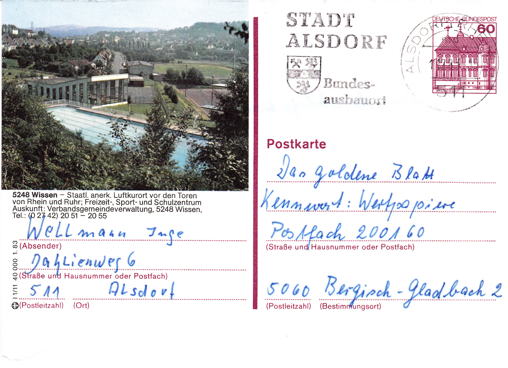 Ergänzend zum ersten Beitrag von LR/07/576/GL zur Stadt Wissen zeige ich noch eine bild- und textgleiche Bildpostkarte aus dem Jahrgang 1988: