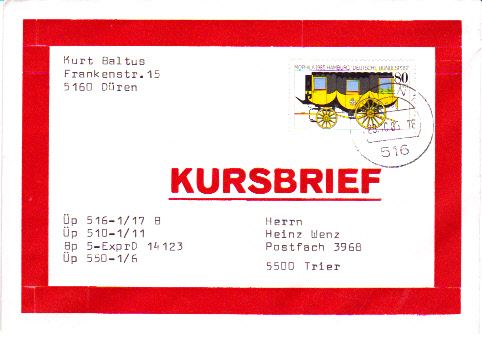 Hier zeige ich einen Kursbrief von Düren nach Trier. Die exakte Postverbindung ist links unten angegeben. Der Brief ist 28.10.1985 um 18 Uhr in Düren aufgegeben worden und wurde mit ÜP 516-1/17 B, Üp 510-1/11, Bp 5-ExprD 14 123 und ÜP 550-1/6 nach Trier befördert. Unterwegs erhielt er rückseitig einen Stempel ( 14123/28), der bestätigt, dass er mit dieser Bahnpost am 28. befördert wurde. Ein Ankunftsstempel in Trier wurde nicht abgeschlagen. Der Brief wurde nach Ankunft sofort ins Postfach gelegt. Das Briefporto betrug für den Brief bis 20 Gramm 80 Pfennig. Die monatliche Gebühr betrug 100 DM.