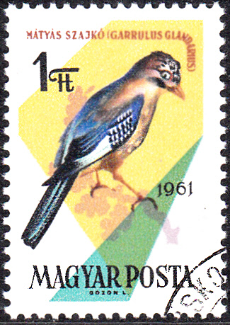 Eine weitere Marke mit einem Eichelhäher (Garrulus glandarius) wurde in Ungarn ausgegeben (MiNr 1811 A).