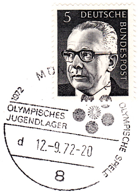 Sonderstempel "Olympisches Jugendlager" vom 12.9.1972 mit Uhrzeit und mit dem Kennbuchstaben "d".
