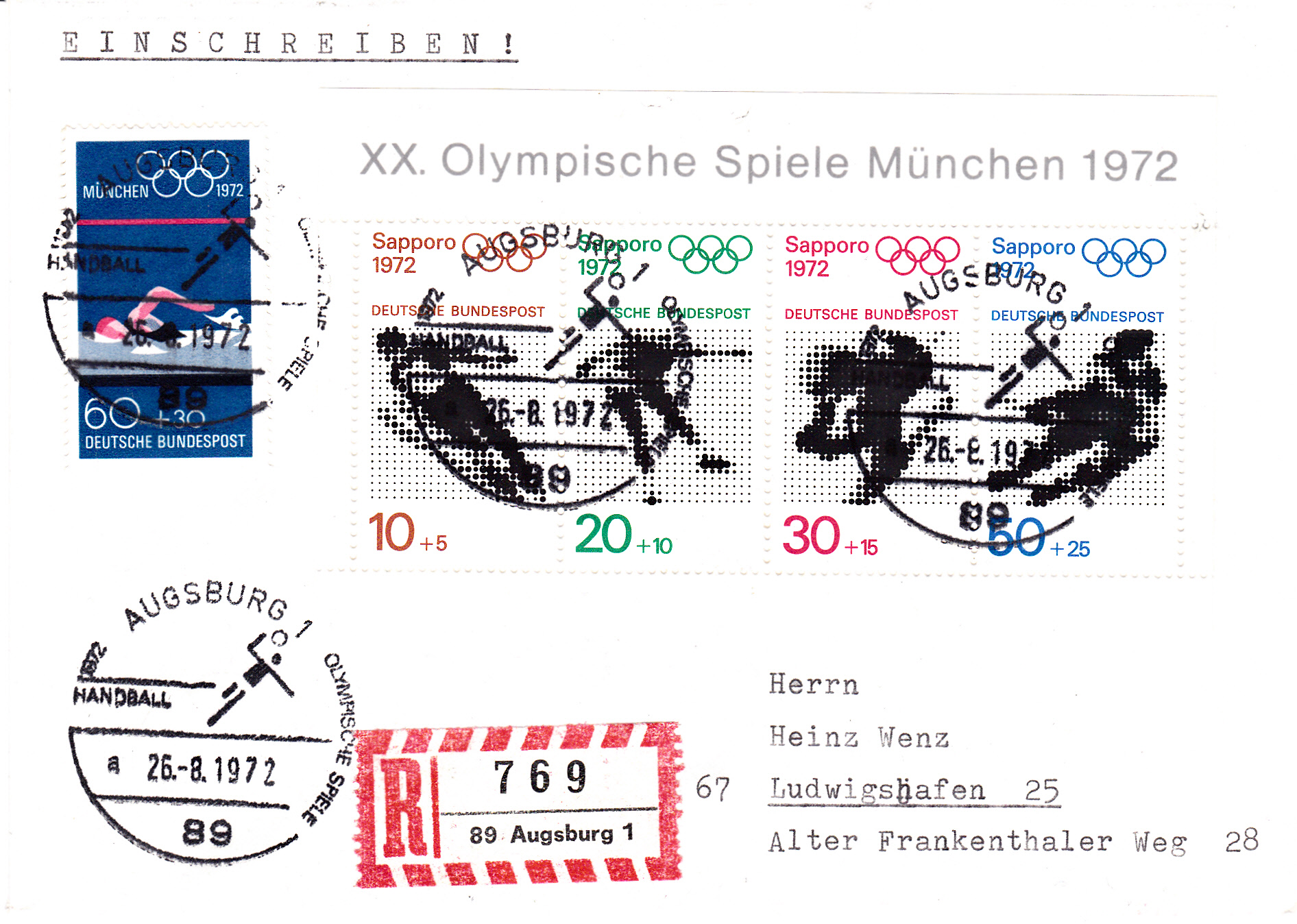 In Augsburg fanden auch Spiele zum Olympischen Handballturnier statt. Brief per Einschreiben mit dem normalem R-Zettel Augsburg und mit dem Sonderstempel "Handball" vom 26.8.1972 mit dem Kennbuchstaben "a" mit vollständigem Datum ohne Uhrzeit.