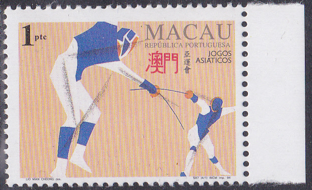 Diese Marke aus Macau (MiNr 770) zu den Asienspielen 1994 zeigt zwei Fechter beim Kampf.