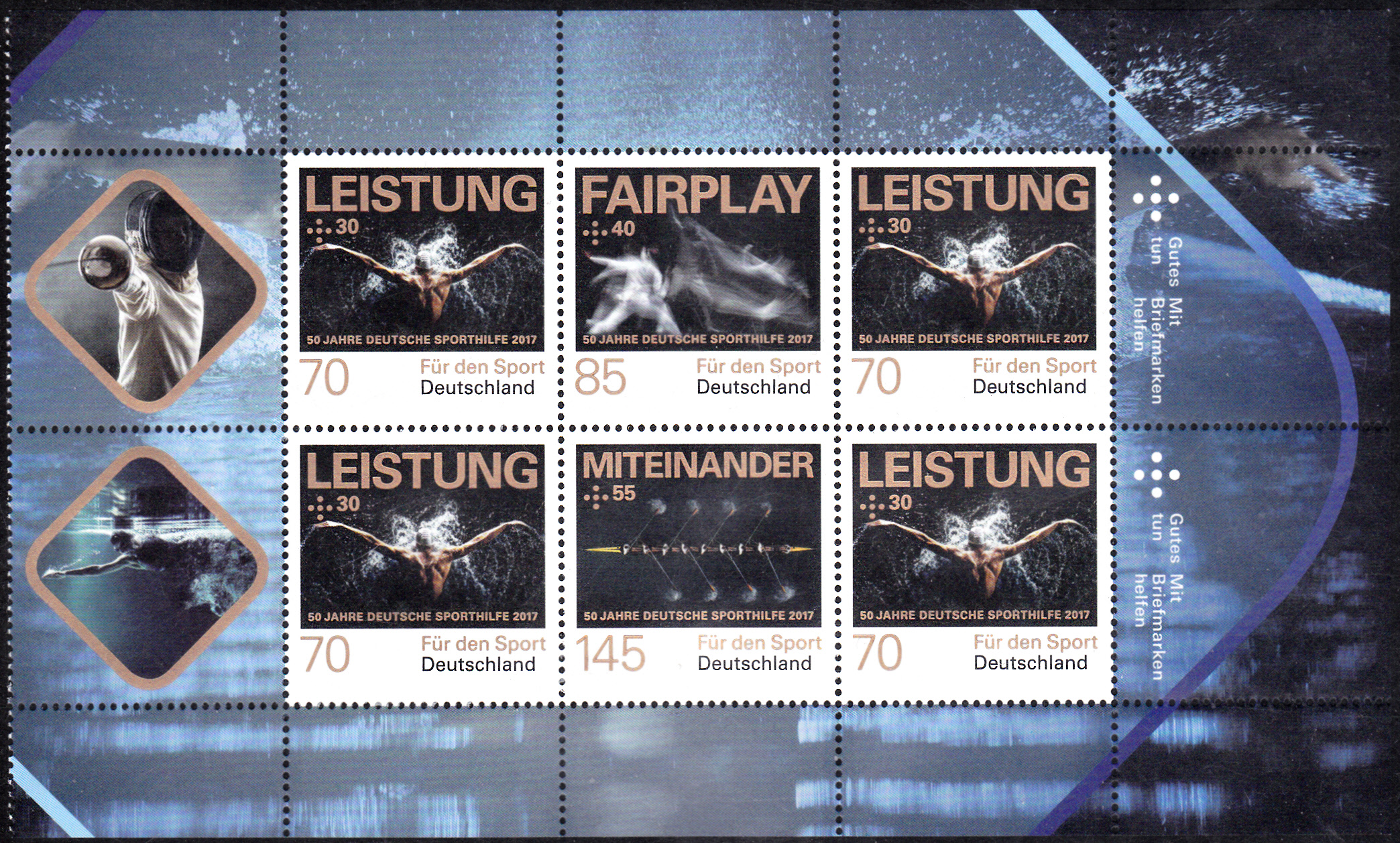 Die Marke zu 85+40 Cent der Ausgabe "50 Jahre Deutsche Sporthilfe" (MiNr 3308) zeigt Fechter beim Kampf. Die Darstellung soll "Faiplay" symbolisch darstellen.