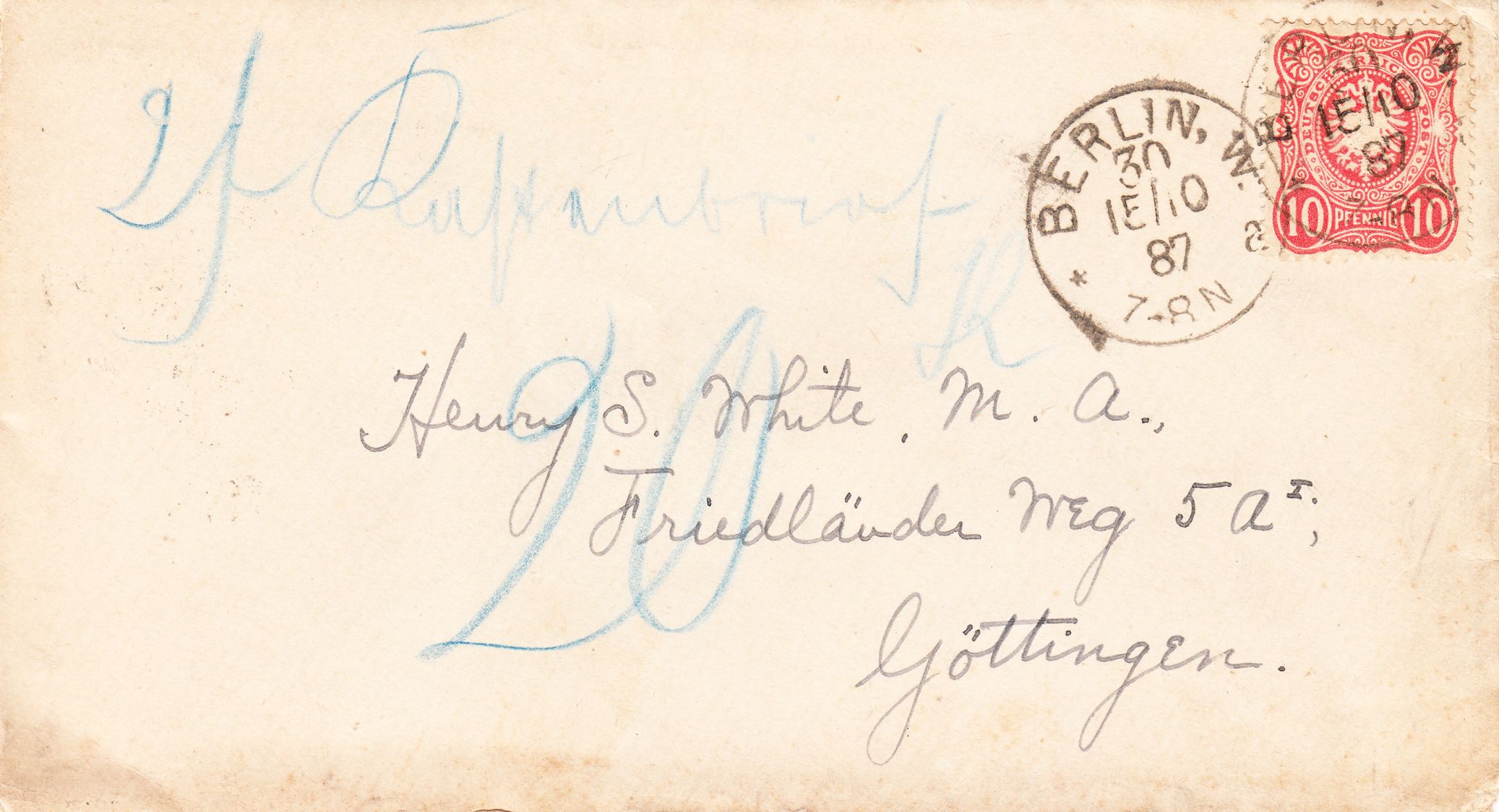 Hier als Beispiel ein gemäß der ersten Gewichtsstufe bis 15 Gramm mit 10 Pfennig frankierter Brief vom 15.10.1887 aus Berlin, adressiert nach Göttingen: