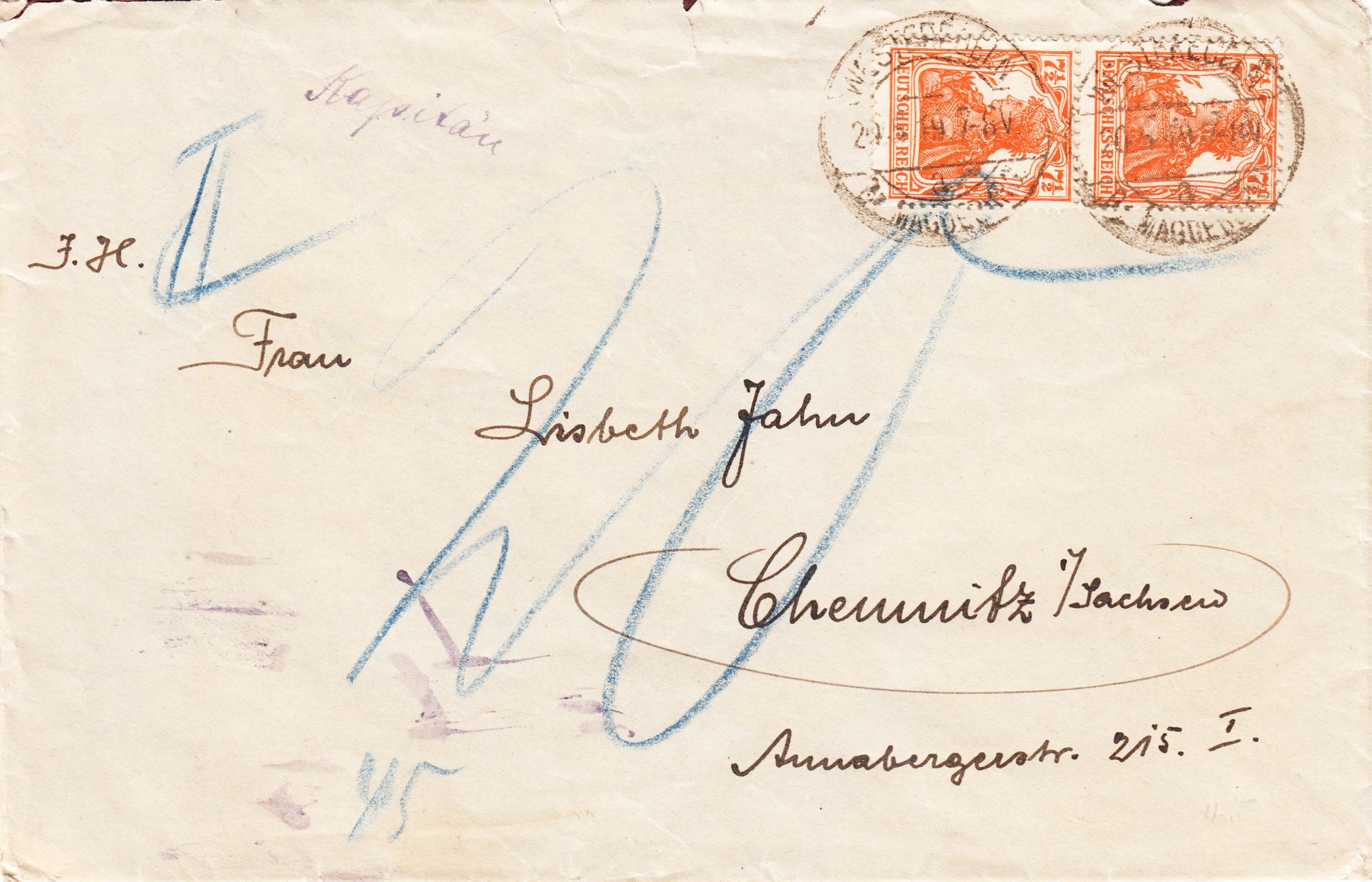 Auch dieser Brief muß schwerer gewesen sein als 15 Gramm, weshalb das Doppelte des Fehlbetrages von 10 Pfennig, also "20" Pfennig in Blaustift vermerkt und beim Empfänger als Nachporto erhoben wurde.