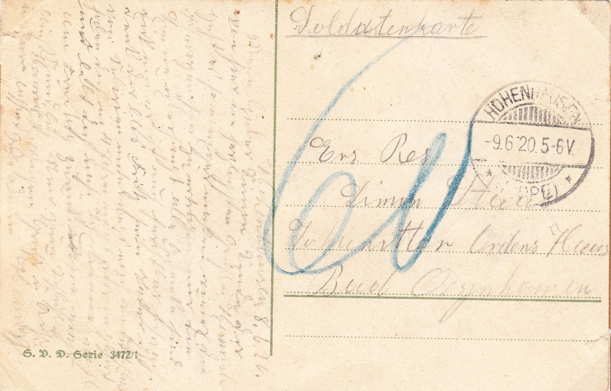 Bei dieser am 09.06.1920 in HOHENHAUSEN aufgegebenen "Soldatenkarte" wurde keine Portofreiheit anerkannt und mit "60" Pfennig das Doppelte der Gebühr für eine Postkarte im Fernverkehr als Nachporto erhoben: