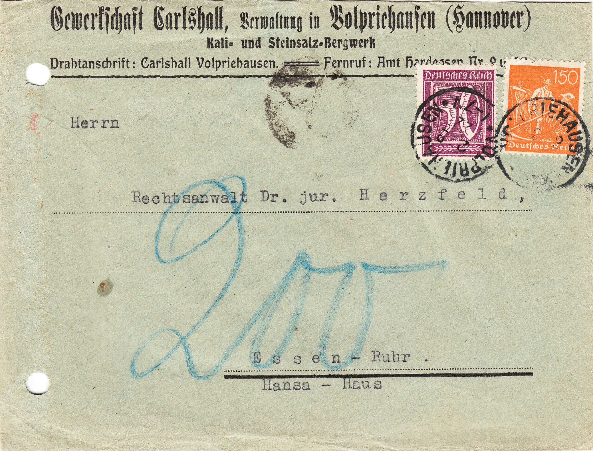 Dieser nach Essen adressierte Brief wurde am 02.02.1922 in Volpriehausen aufgegeben, als Fernbrief der ersten Gewichtsstufe bis 20 Gramm portorichtig mit 200 Pfennig frankiert: