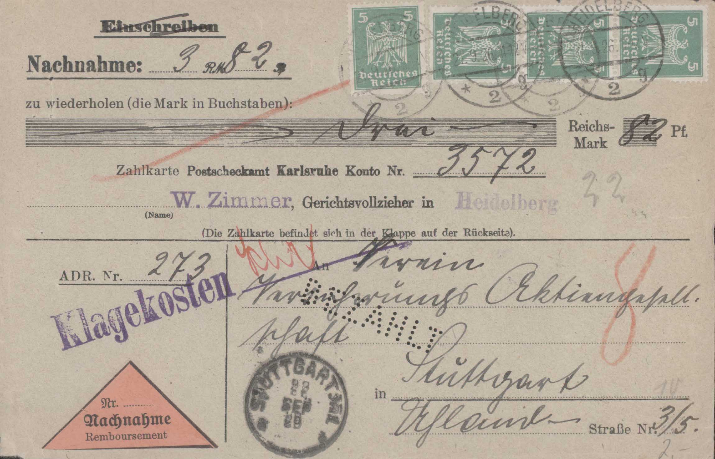 Leider komme ich beim Beschreiben nur so weit, dass es ein Nachnahme-Beleg mit einer Mehrfach-Frankatur von MiNr. 356 des Deutschen Reiches ist, entwertet am 21.09.1926 in Heidelberg.