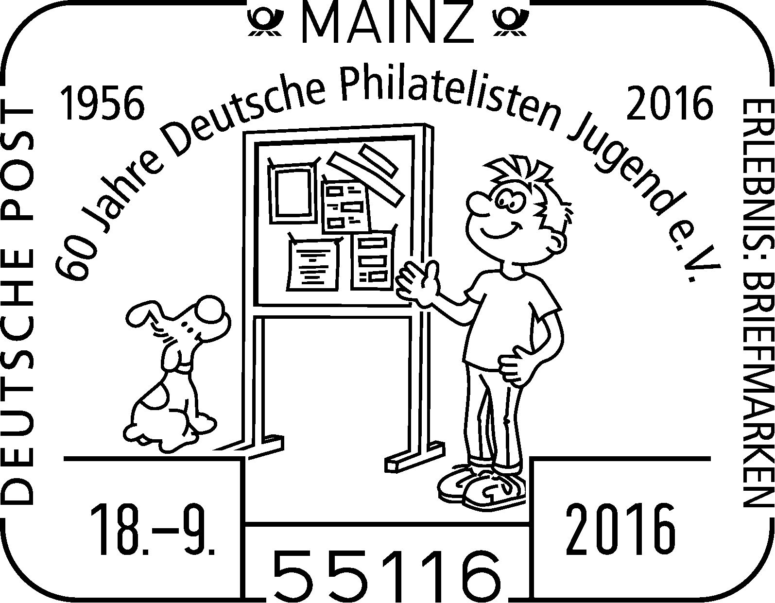 Die Ausstellung mit insgesamt wieder mehr als 30 Briefmarkenexponaten von Kindern und Jugendlichen bis 21 Jahre werden am 17.09. von 9.00 Uhr bis 16.00 Uhr und am 18.09. von 9.00 Uhr bis 15.00 Uhr im Haus der Jugend, Mitternachtsgasse 8 in 55116 Mainz ausgestellt. Die Deutsche Post AG ist an beiden Tagen mit einer Sonderpostfiliale vertreten und hat drei Sonderstempel im Angebot: einen zur Deutschen Mannschaftsmeisterschaft, einen zum Stiftungswettbewerb und einen zum Jubiläum „60 Jahre Deutsche Philatelisten Jugend e.V“.