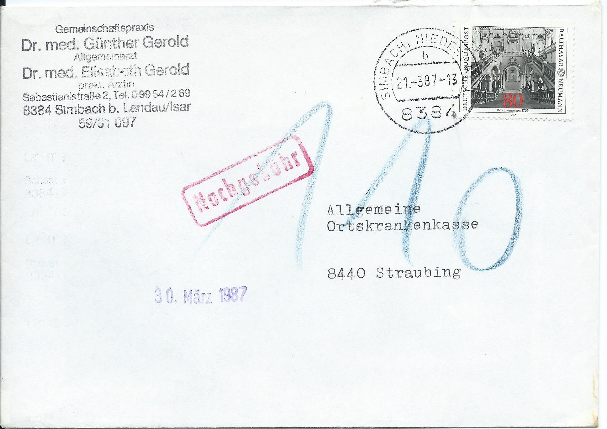 Ein mit 80 Pf frankierter Beleg aus Kirchroth vom 9.2.87, welcher auch wieder mehr als 20 gr gewogen haben muss und somit 1,10 DM Nachgebühr kassiert worden sind. Also nach Deiner Liste 50 Pf fehlendes Porto (1,30 DM bei 20-50 gr) und 60 Pf Gebühr ergibt die 1,10 DM.