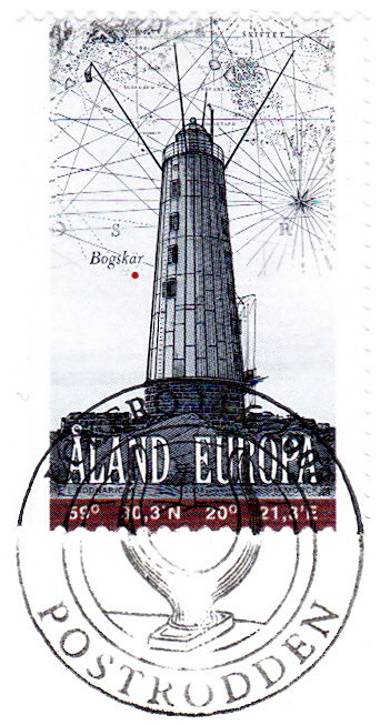 Auf dieser Marke der Alandinseln (MiNr 29ß) ist der alte dreieckige Leuchtturm abgebildet. Der Standort des Turmes ist auf der Karte auf der Marke markiert.