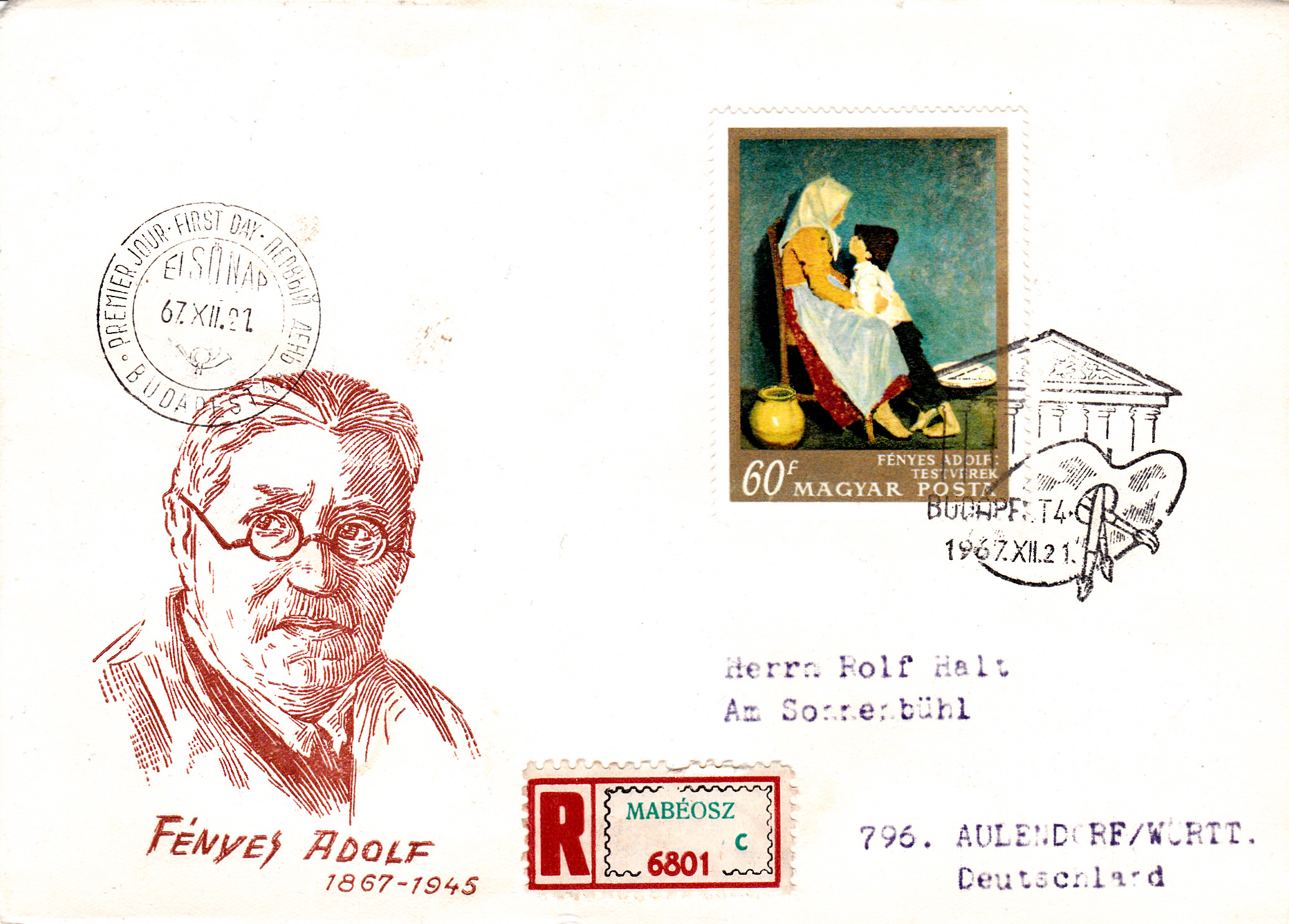 In der Serie "Gemälde der Nationalgalerie Budapest Meister des 20. Jahrhunderts" erschien auch diese Marke (MiNr 2370 A)mit seinem Werk "Geschwister", hier auf einem per Einschreiben gelaufenem Erstagsbrief. Rückseitig wurden weitere Marken verklebt.
