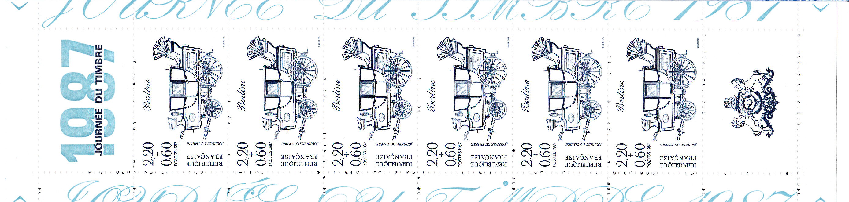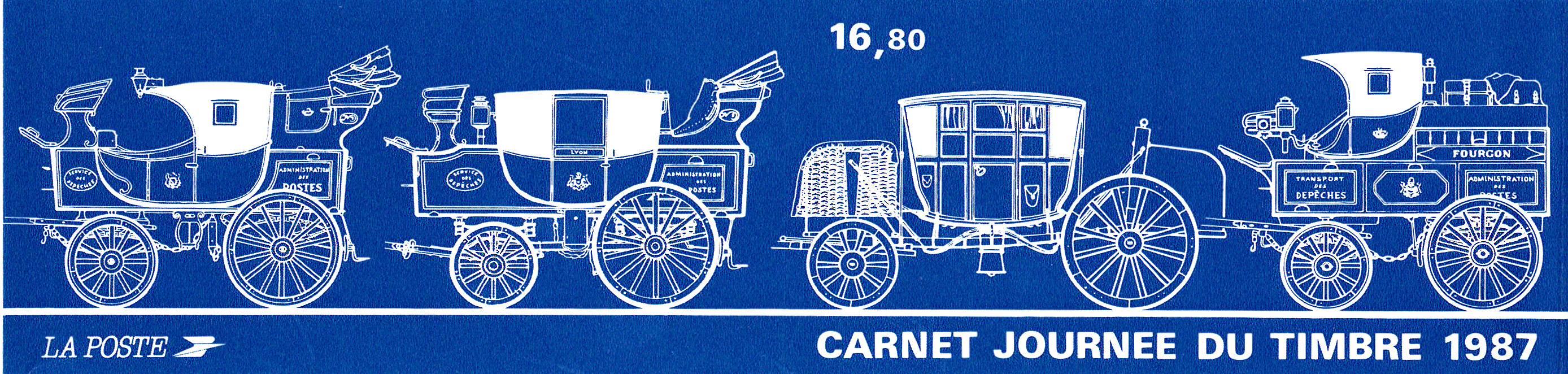 In Frankreich erschien am 14.3.1987 eine Marke zum Tag der Briefmarke 1987 mit der Abbildung einer Postkutsche "Berline" (1837). Die Marke ist im Bogen (MiNr 2600 A a)in der Farbe schwarzbraun auf weißgelbem Papier mit der Zähnung K 12 3/4:13 und im Markenheftchen in der Farbe (MiNr 2600 C b) schwarzblau auf weißblauem Papier in der Zähnung K 13 erschienen.