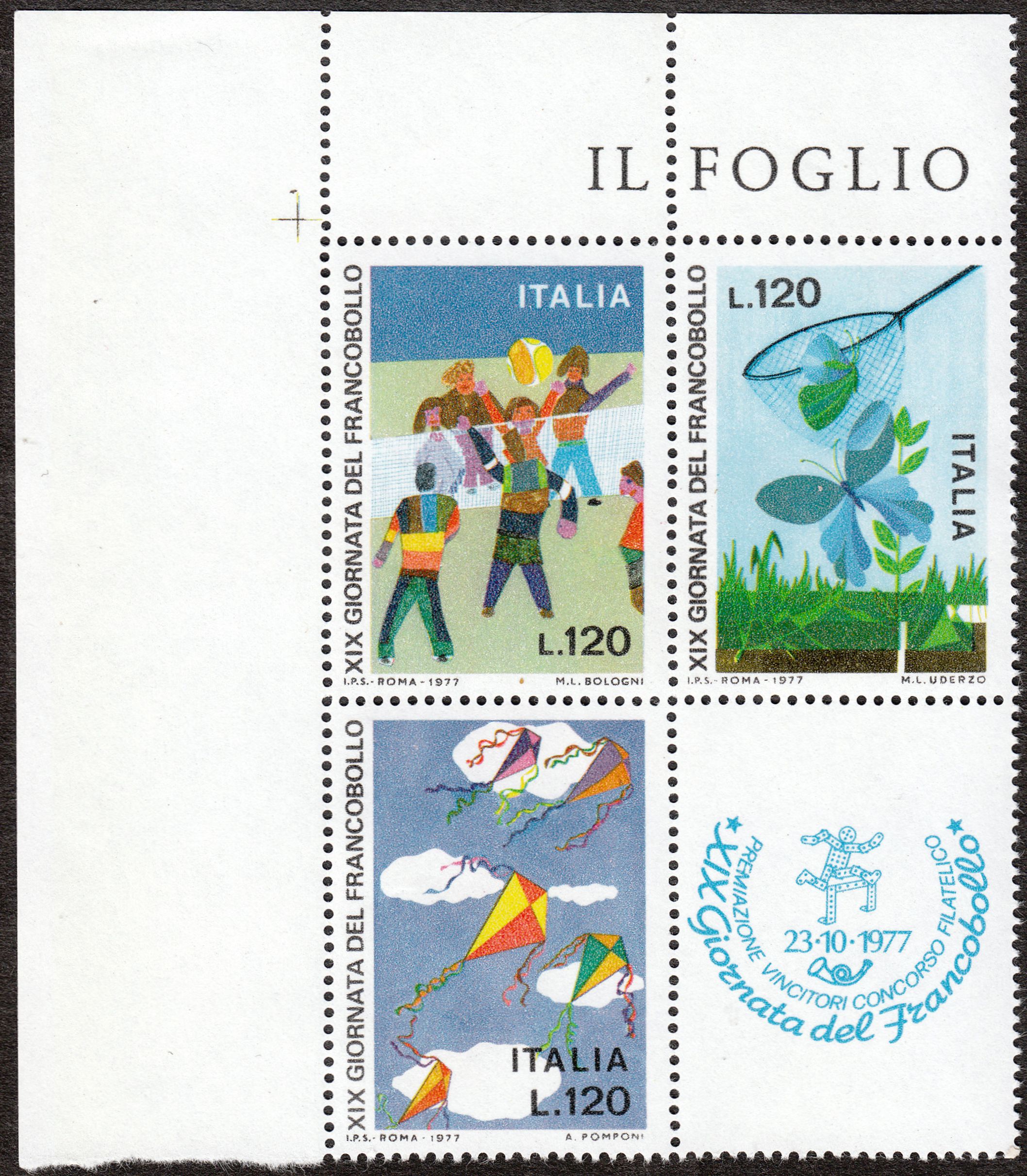 In Italien erschienen drei Werte zum Tag der Briefmarke 1977 mit Kinderzeichnungen, MiNr. 1586 bis 1588.