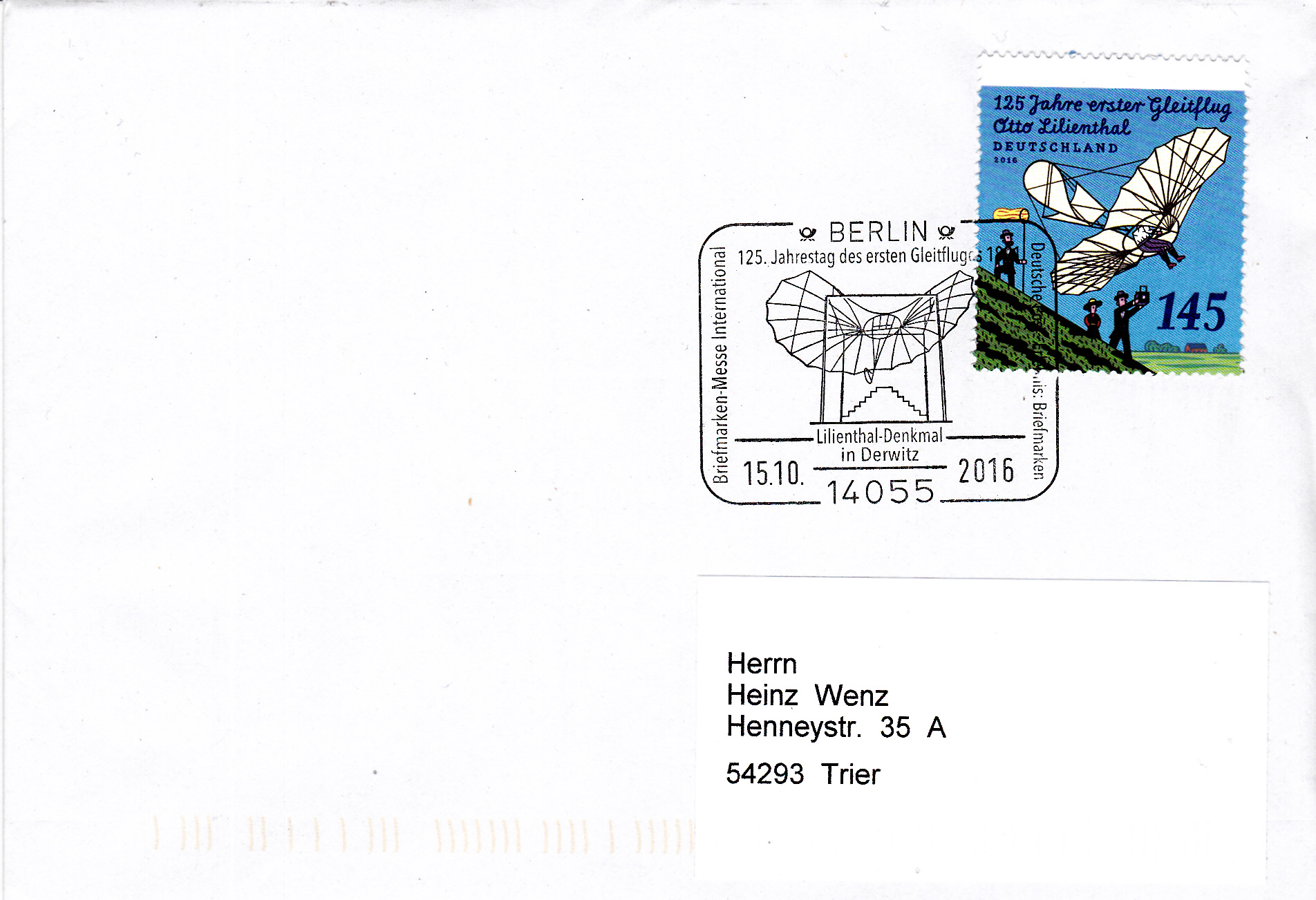 Im Sonderstempel vom 15.10.2016 aus Berlin zur Briefmarkenmesse ist aus Anlass des 125. Jahrestages des ersten Gleitfluges von Otto Lilienthal das Lilienthal-Denkmal in Derwitz abgebildet.