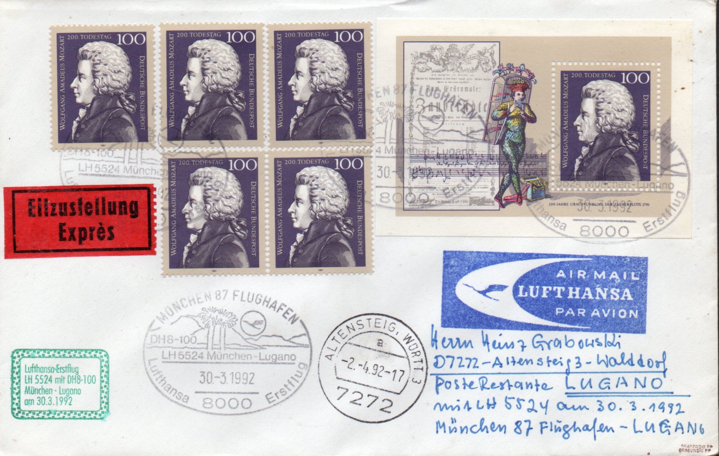 Block 26 zum 200. Todestag von Wolfgang Amadeus Mozart sowie 5 x die Einzelmarke daraus auf Eilbrief nach Lugano.