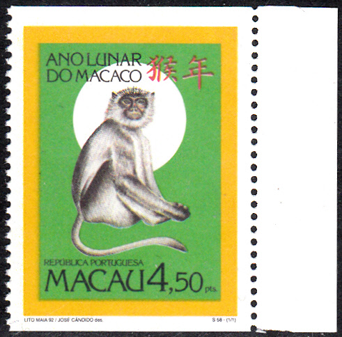 Zum Chinesisches Neujahr "Jahr des Affen" (4. Februar 1992 bis 22. Januar 1993) erschien am 23.3.1993 eine Marke mit der Abbildung eines Affen. Hier eine vierseitig gezähnte Marke aus dem Bogen (MiNr 694 A):