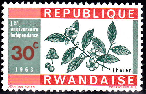 Diese Marke aus der Serie "1 Jahr Unabhängigkeit" aus Ruanda (MiNr 29 A) bildet einen Teezweig ab.