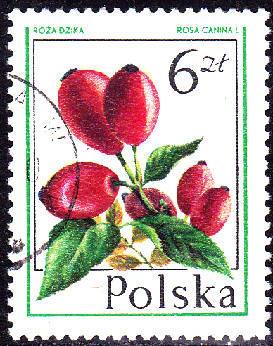 Aus Polen kommt diese Marke (MiNr 2493) mit Hagebutten (Rosa canina).