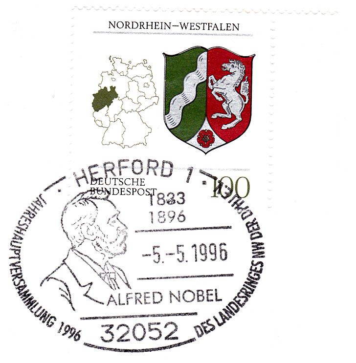 Im Sonderstempel zur Jahreshauptversammlung des Landesringes NRW der Deutschen Philatelisten Jugend e.V. am 5.5.1996 in Herford wurde zu seinem 100. Todestag ein Bild von Alfred Nobel gezeigt. Sein Geburtsjahr und sein Todesjahr sind im Stempel ebenfalls erwähnt.