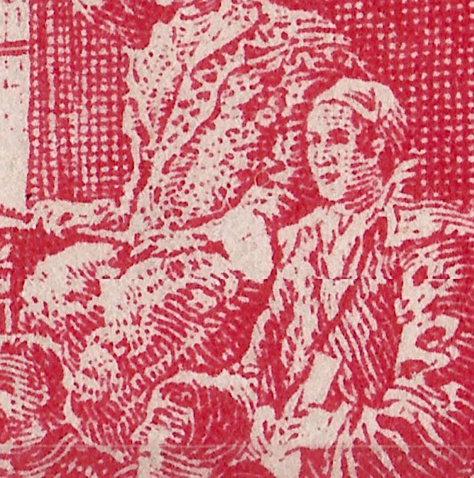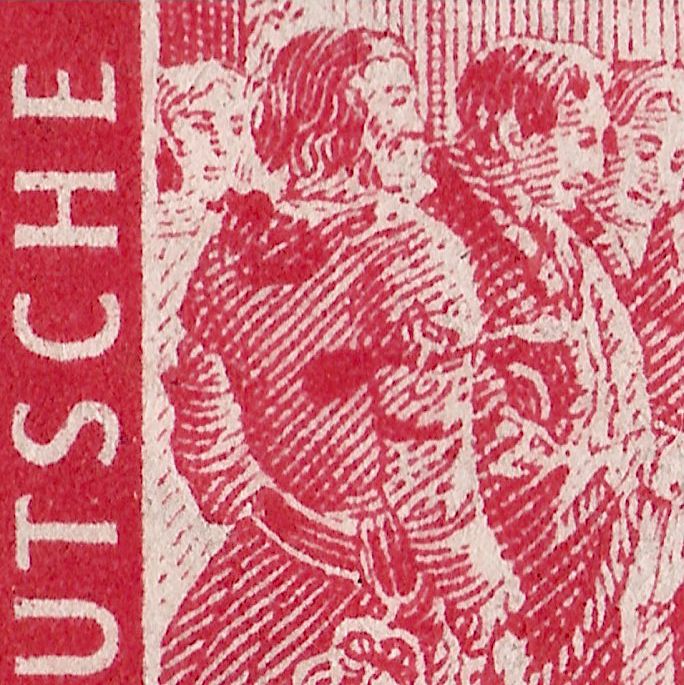 Postfrische Einzelmarke mit Michel-Plattenfehler XIV: Farbfleck im Rücken des links stehenden Mannes (Feld 24, Teilaufl.).