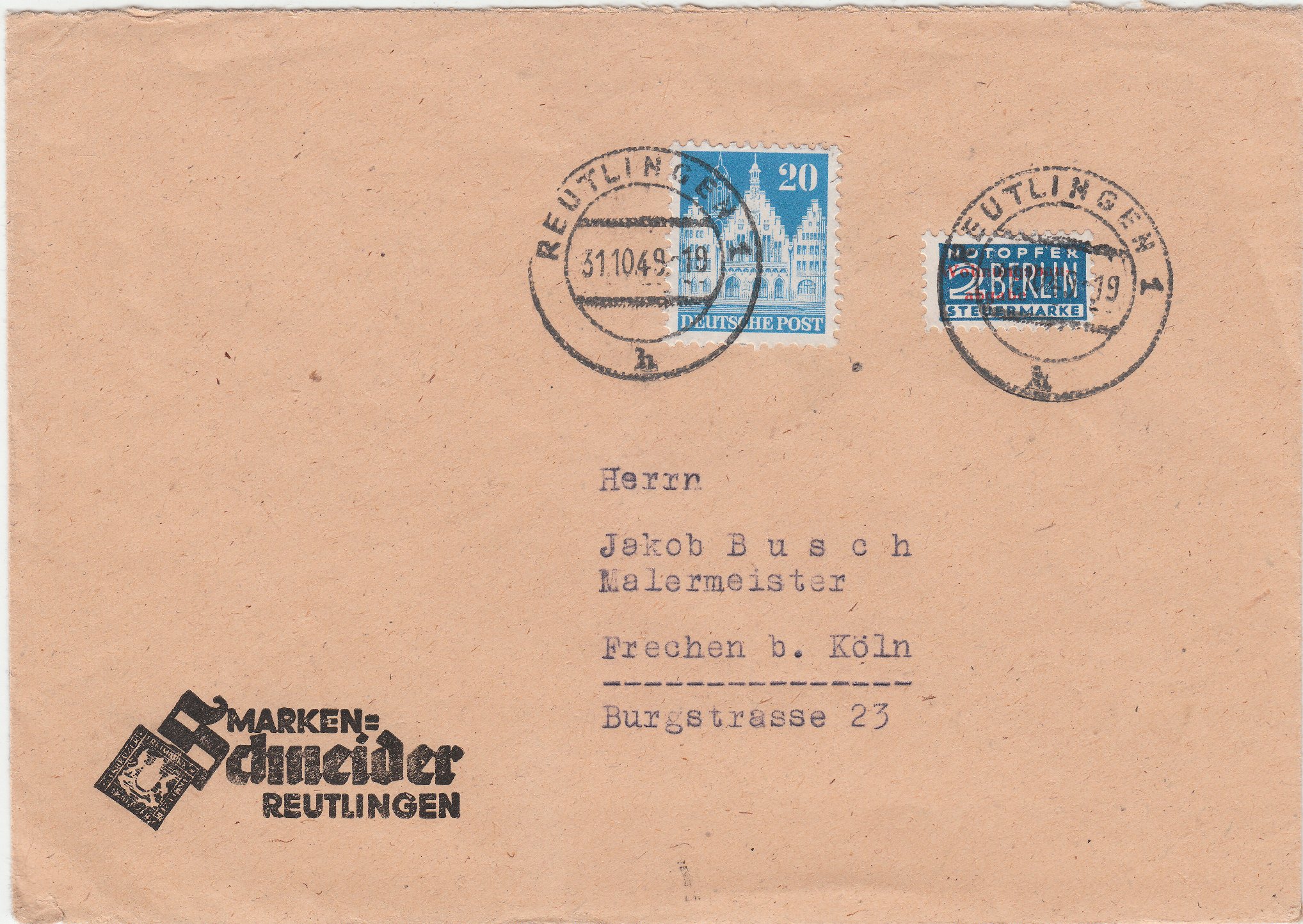 Hier als Beispiel die Kombination eines 20 Pf Wertes der Bautenserie mit einer Zwangszuschlagsmarke MiNr. 2 von Württemberg am 31.10.1949 portorichtig auf einem Fernbrief von REUTLINGEN nach Frechen bei Köln: