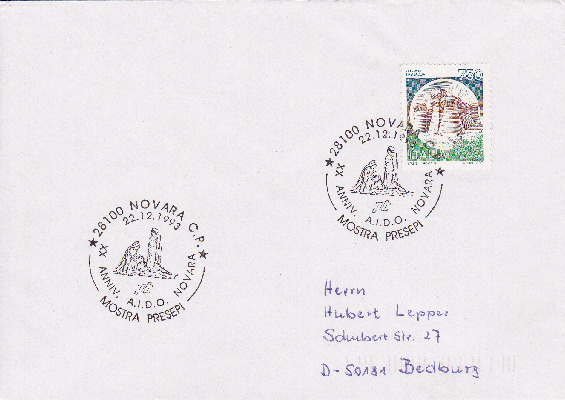 Sonderstempel vom 22.12.1993 aus Novara zu einer Krippenschau. Im Stempelbild ist eine Krippendarstellung zu sehen.