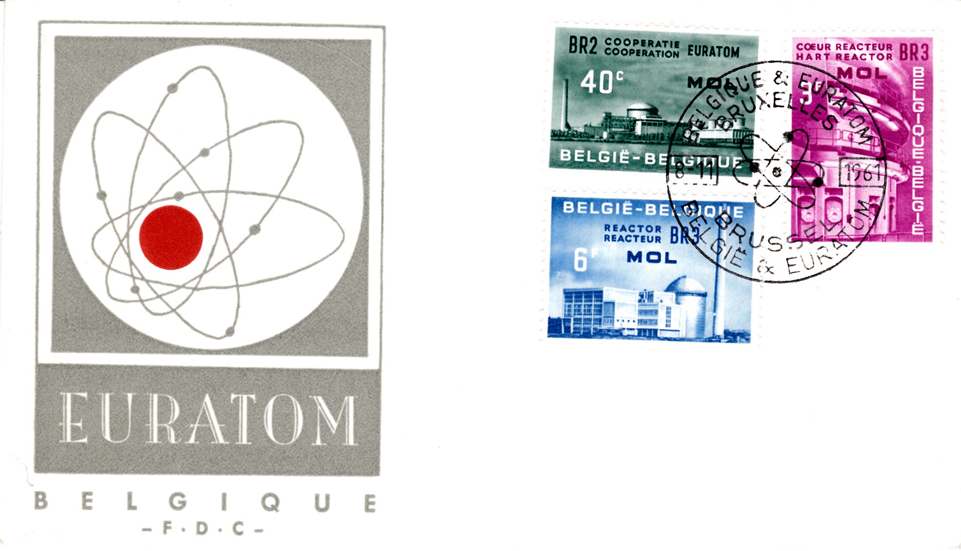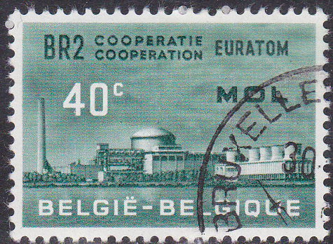 Auf dieser Marke (MiNr 1255) aus dem Jahre 1961 ist der Kernreaktor BR 2 zu sehen. Der Baubeginn für den leichtwassergekühlten Reaktor mit einer thermischen Leistung von 100 MW war am 1. Januar 1958. Er konnte am 29. Juni 1961 in Betrieb gehen.