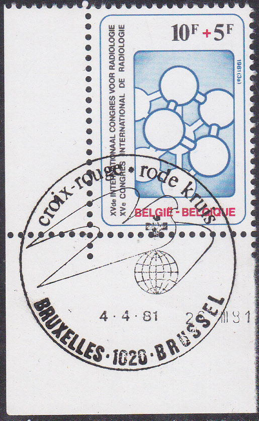 Zum XV. Internationalen Kongress für Radiologie in Brüssel im Jahre 1981 ist in Belgien eine Marke (MiNr 2056) erschienen, die das Atomium in Brüssel im Emblem des Kongresses zeigt. Hier ein mit dem Ersttagsonderstempel gestempeltes Eckrandstück mit Druckdatum.