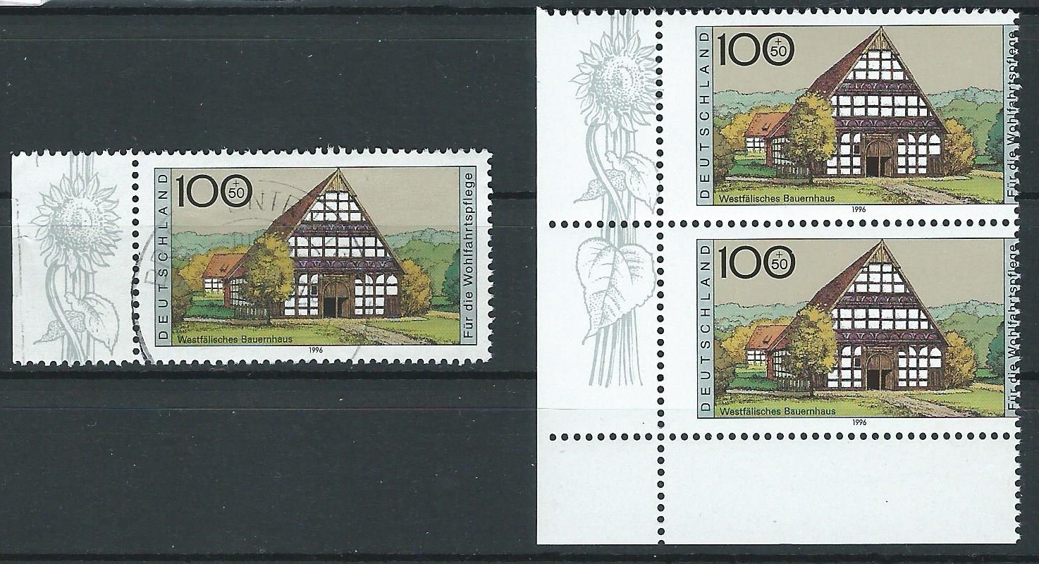 hier wird ein Stück vorgestellt, welches den Thread-Titel im positiven Sinne voll erfüllt. Es handelt sich um die Bund Michel-Nummer 1886, Wohlfahrt 1996 100 + 50 Pf, Motiv Westfälisches Bauernhaus. Das senkrechte Paar ist mir kürzlich in einem "Groschenbuch" auf einem Flohmarkt ins Auge gefallen und landete sofort in meiner Entnahmeschale.