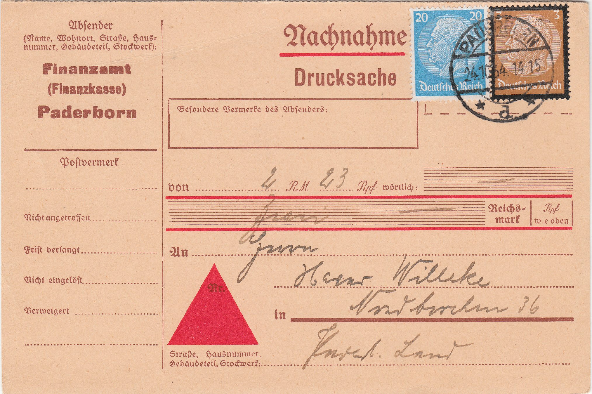 Eine Drucksache (3 Pf) per Nachnahme (20 Pf) ergibt die Portostufe 23 Pf, hier am 24.10.1934 portorichtig frankiert als Mischfrankatur von Hindenburg Medaillon sowie Hindenburg Medallion mit Trauerrand: