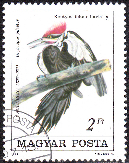 Zum 200. Geburtstag von John James Audubon, einem US-amerikanischen Ornithologen und Zeichner, ist in Ungarn eine Serie mit Vogelzeichnungen von ihm erschienen. Hier ein Marke dieser Serie (MiNr 3761 A) mit einem Helmspecht (Dryocopus pileatus).