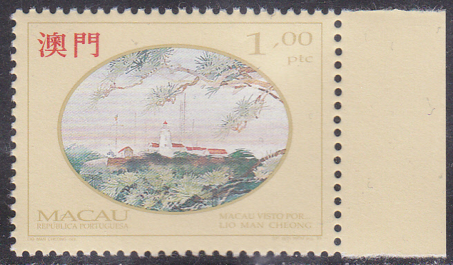 Diese Marke aus Nacau (MiNr 787) zeigt ein Gemälde von Lio Man Cheong mit der Guia-Festung und dem Leuchtturm.