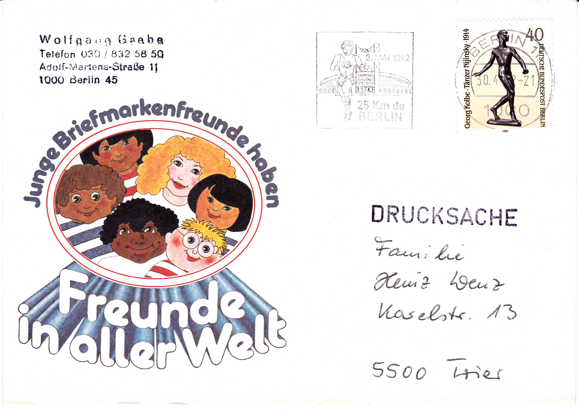 Die in Berlin erschienene Marke (MiNr 655) mit der Abbildung der Skulptur "Tänzer Nijinsky" (1914) von Georg Kolbe wurde hier portogerecht am 30.4.1982 als Einzelfrankatur auf einer Drucksache bis 20g von nach Trier verwendet.