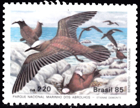 Auf dieser Marke der Weihnachtsinsel (MiNr 381) sehen wir Philippinen-Noddiseeschwalben (Anous stolidus pileatus).