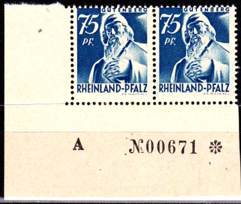 Paar vom linken unteren Bogenrand. Unterhalb der beiden linken unteren Marken im Bogen befindet sich bei kleinformatigen Marken der Französischen Zone immer die Bogenzählnummer. Vorangestellt ist jeweils der Buchstabe A oder B zur Unterscheidung der jeweils nebenander gedruckten Bogenpaare. Hier handelt es sich um den linken Bogen, der jeweils der "A"-Bogen ist.
