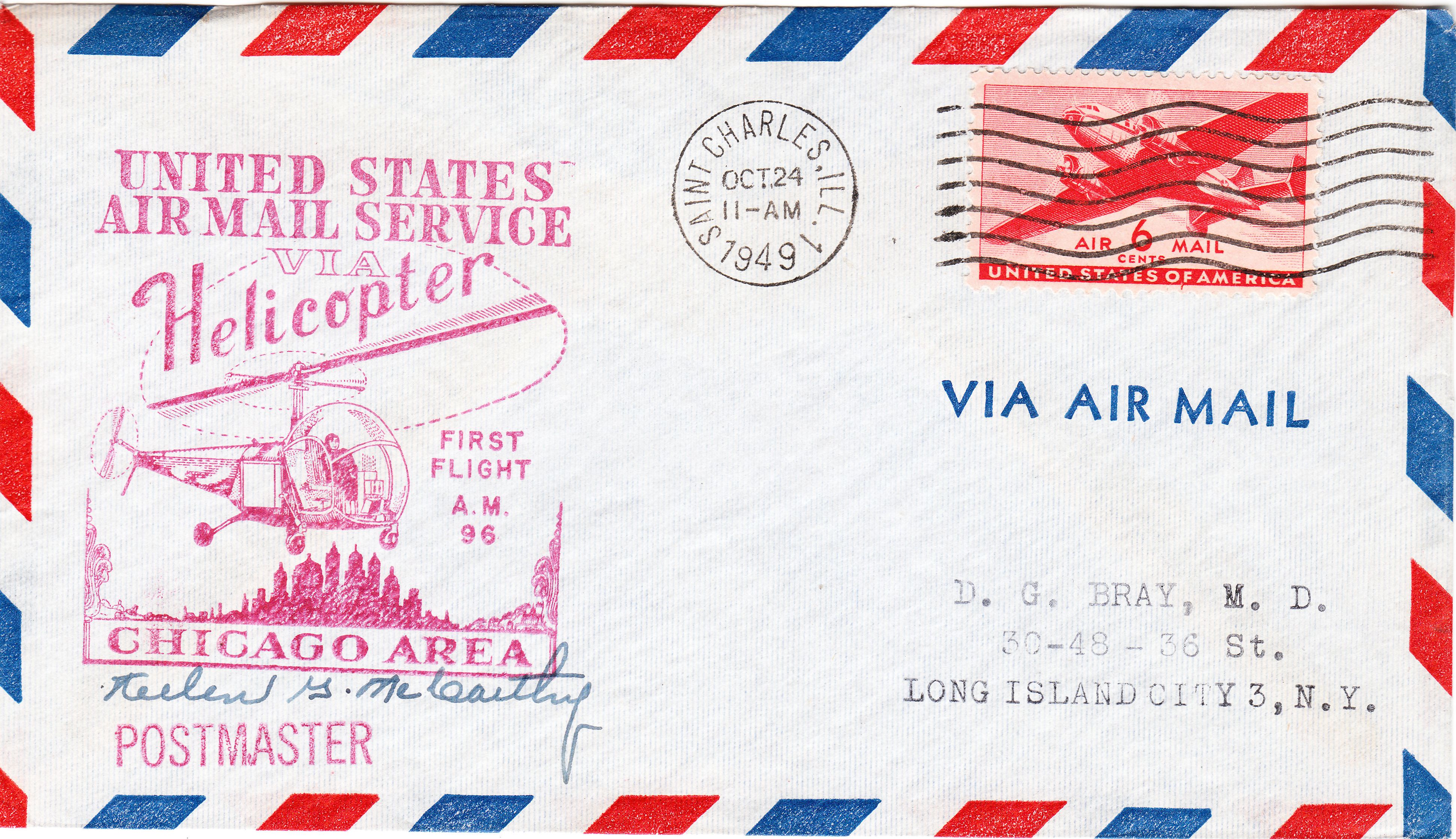 Hier als Beispiel ein Beleg vom 24.10.1949 aus Saint Charles, Illinois, adressiert nach New York, per Hubschrauber befördert von Saint Charles nach Chicago::