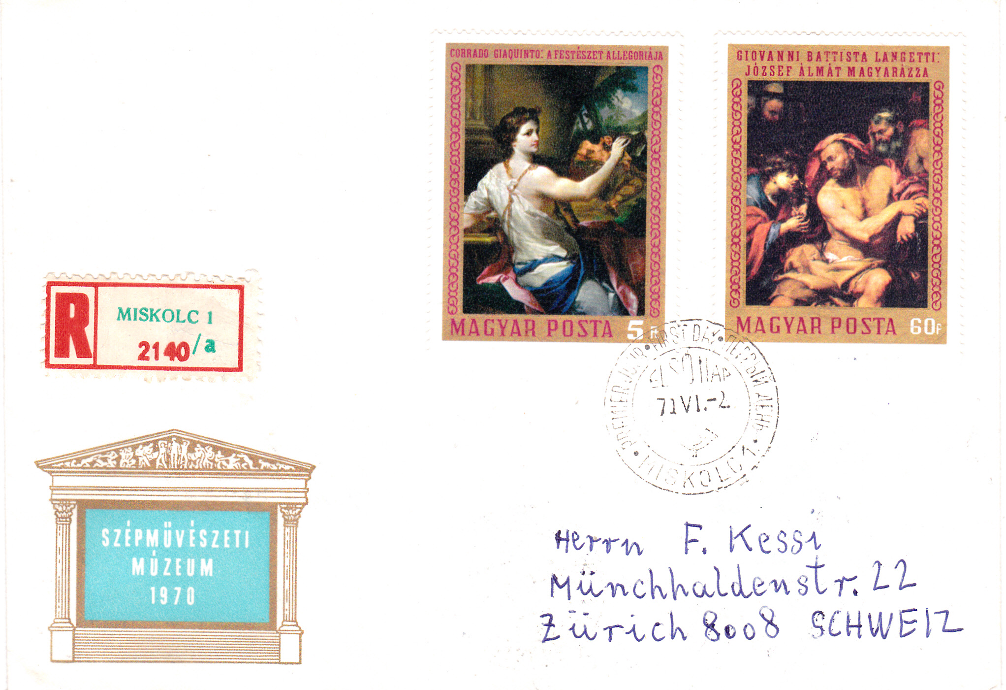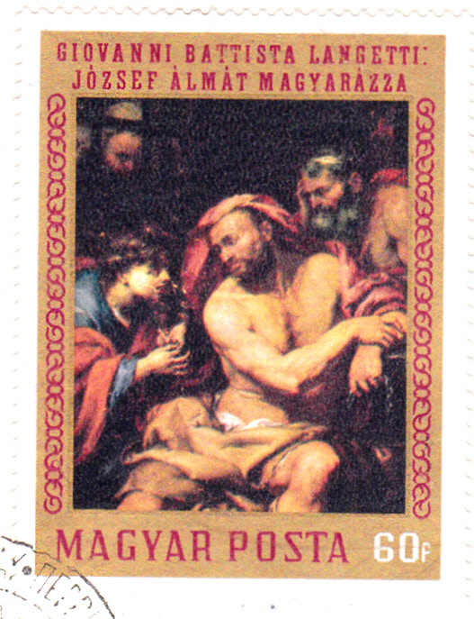In einer Serie "Gemälde" ist in Ungarn auch eine Marke (MiNr 2587 A) mit dem Gemälde "Josef erklärt seinen Traum" von Giovani Battista Langetti erschienen. Hier wurde eine Marke auf einem Brief mit Einschreiben in die Schweiz zur Frankatur verwendet. Die Marke gibt es auch geschnitten. Rückseitig wurden zwei Marken zur Vervollständigung des Portos verklebt. Ebenfalls auf der Rückseite ist ein Ankunftsstempel aus Zürich zu sehen.
