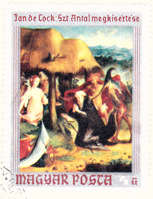 In einer Serie "Gemälde" ist in Ungarn auch eine Marke (MiNr 2638 A) mit dem Gemälde "Die Versuchung des hl. Antonius" von Jan de Cock erschienen. Hier wurde eine Marke auf einem Brief mit Einschreiben in die Schweiz zur Frankatur verwendet. Die Marke gibt es auch geschnitten. Rückseitig wurden zwei Marken zur Vervollständigung des Portos verklebt. Ebenfalls auf der Rückseite ist ein Ankunftsstempel aus Zürich zu sehen.