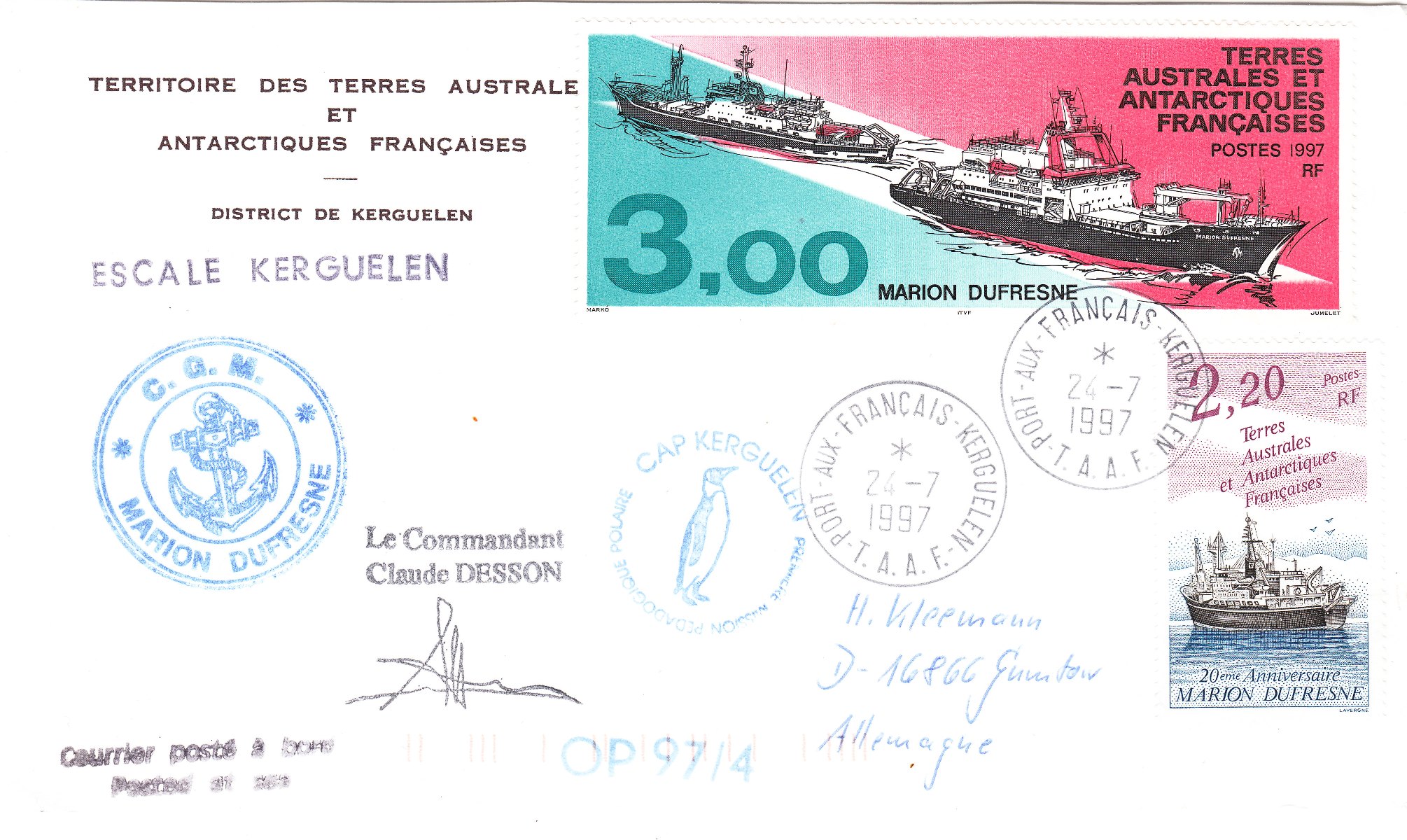 Der Beleg wurde bei einem Zwischenstopp auf den Kerguelen = "ESCALE KERGUELEN" der Post von TAAF übergeben, die die Frankatur am 24.07.1997 entwertete.