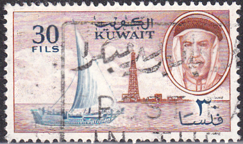 In der gleichen Serie ist auch diese Marke (MiNr 153) mit einem Segelschiff, einem Bohrturm und einer Abbildung von Scheich Abdullah as-Salim AI Sabah mit einer Kufiya erschienen.