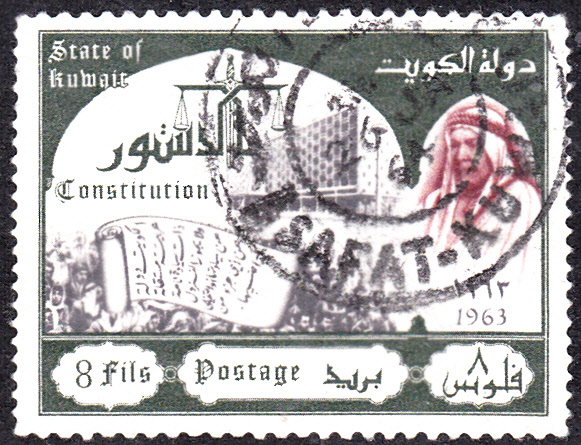 Auch auf einer Markenserie "Verfassung" wurde in Kuwait Scheich Abdullah as-Salim AI Sabah (1899-1965, reg. ab 1950) mit einer Kufiya abgebildet. Hier zwei der insgesamt sechs motivgleichen Marken: