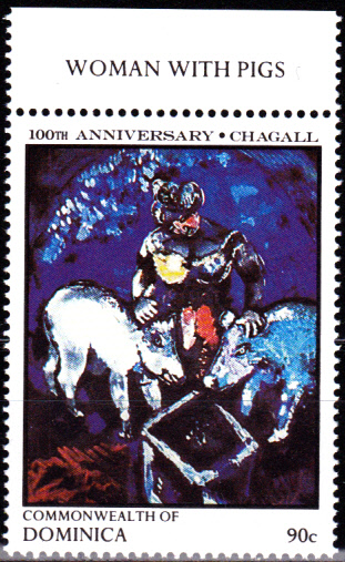 Auf dem Wert zu 90c aus der Serie zum 100. Geburtstag von Marc Chagall aus Dominica (MiNr. 1027) ist das Werk "Frau mit Schweinen" abgebildet. Beim gezeigten Oberrandstück ist der Name des Bildes in Englisch auf dem Bogenrand zu lesen.