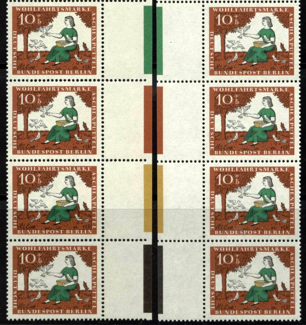 Eine Besonderheit ist die Ausgabe Bogenmarken Sehenswürdigkeiten. Diese Ausgabe hat immer am linken Rand einen durchgehenden Farbbalken. Manchmal hat man das Glück, ein Eckrandstück zu ergattern, bei dem die Farbstreifen sich bedingt durch nicht symmetrische Ausrichtung überlappen.