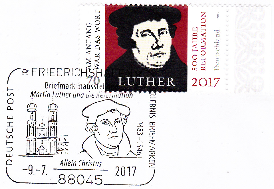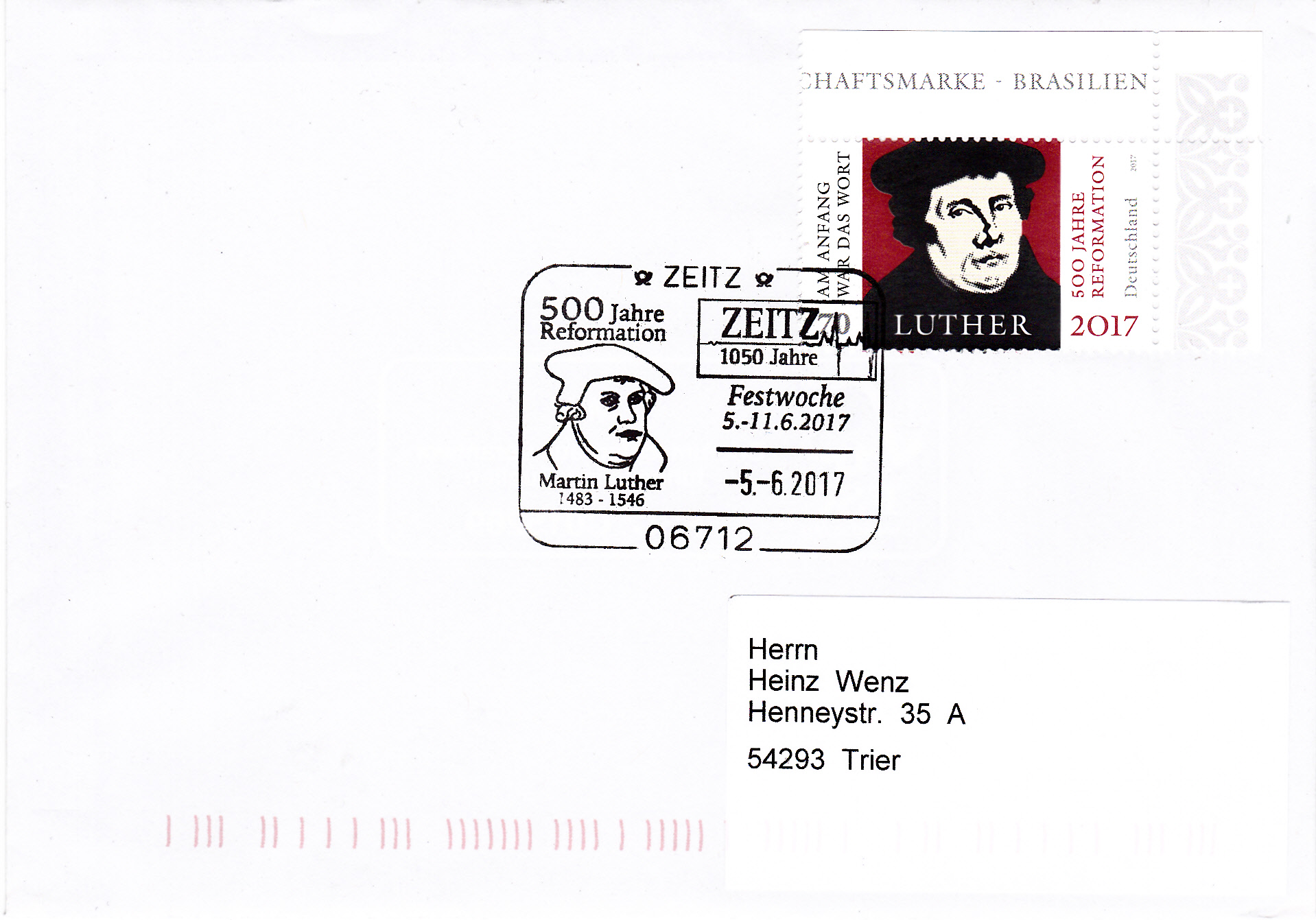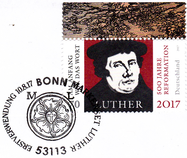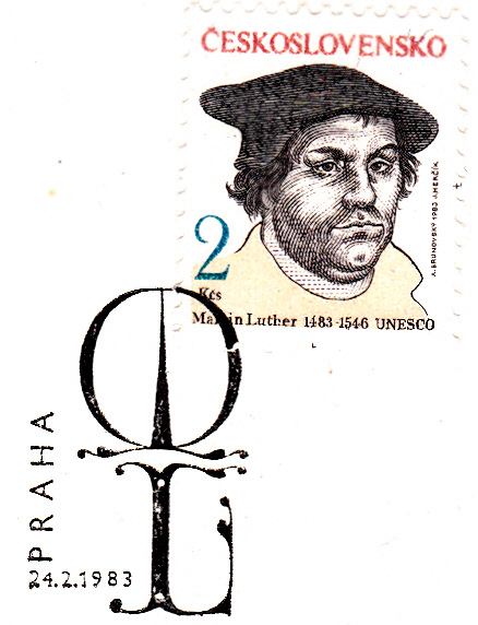 Die bereits hier gezeigte Marke aus der DDR zu 85Pf zum 500. Geburtstag von Martin Luther (MiNr 2757) wurde auf diesem Brief per Eilboten nach Aarberg in der Schweiz als Porto verwendet und mit einem Sonderstempel zum Lutherjahr 1983 in Eisleben gestempelt. Das Porto betrug für einen Brief ins Ausland bis 20g 35Pf und der Zuschlag als Eilsendung 50Pf, zusammen also 85Pf.
