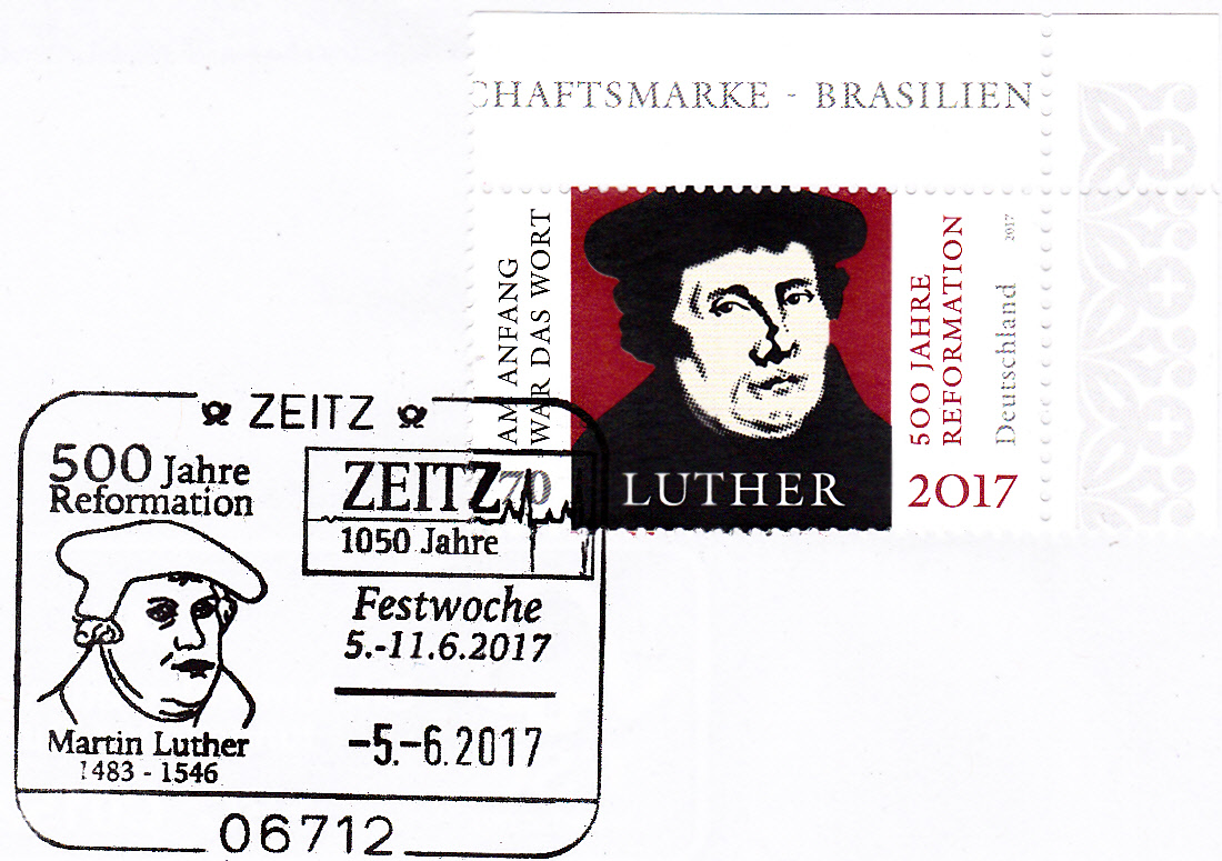 Dieser Sonderstempel vom 5.6.2017 aus Zeitz zeigt im Stempelbild ebenfalls Martin Luther mit seinem Doktorhut.