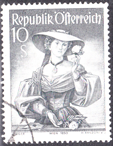 Die Marke zu 10 Schilling (MInr 926) ist etwas größer als die anderen Marken der Serie und zeigt eine Tracht aus Wien um 1850.